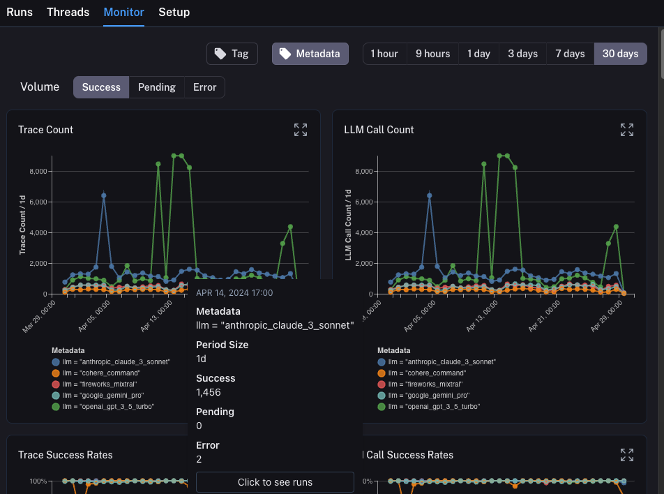 llm. We can group the monitoring charts by ANY metadata attribute, and instantly get grouped charts over time. This allows us to experiment with different LLMs (or prompts, or other) and track their performance over time.